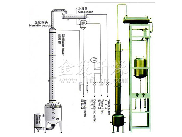 本设备有间歇式和连续式两种形式,主要由塔釜、塔身、冷凝器、平衡罐、冷却器、流量计等部件组成。